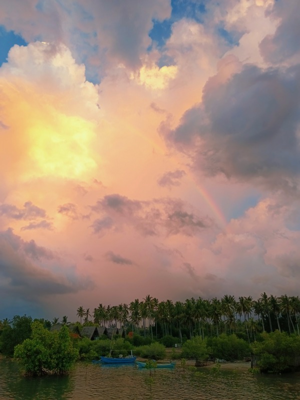 夕日の反対側には虹